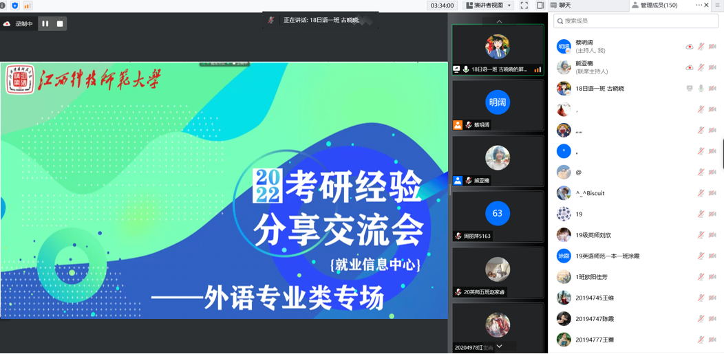 在疫情防控常态化背景下,为做好备考学子的考研指导服务工作,外国语学院于2022年5月14日、15日晚18:30点以腾讯会议形式举办考研经验分享交流会,本次交流会分为外语类专业场和非外语类专业场,外语类专业场由毛星星、曾凯悦、古晓晓、朱研熹、刘志萍同学进行分享;非外语类专业场由詹婷婷、刘星仪同学进行分享,19级、20级150余名学生参加。