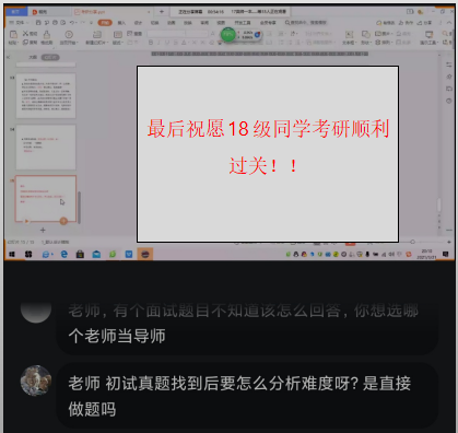 李文博士对即将进行考研复试的同学给予肯定,结合自己多年来的丰富经验,详细介绍了考研复试准备流程和应试策略。他指出,复试是综合素质和综合能力的集中体现,复试者在各个环节都应当细致准备,从衣着、肢体、语言等方面,展示复试者的良好形象。对于复试中经常出现的问题,如自我介绍、学习生活、学术动态等,要反复模拟演练。她强调,在准备复试过程中不仅要重视面试,还要重拾课本,注重笔试与二外复试。针对复试者各自不同的情况及提出的问题,李文博士给予一对一解答,线上交流气氛非常热烈。
