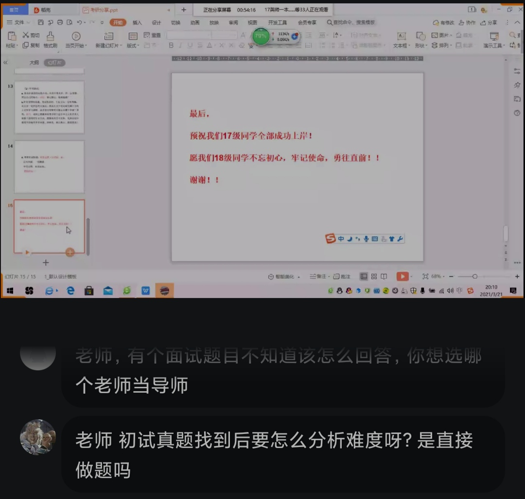 为更好地为学生提供考研复试指导服务,提振学生备考信心,进一步提升学院考研率和保障就业质量,学院于3月21日晚7点举办线上考研复试指导讲座,特邀请学院学科建设办主任朱毅博士进行专题讲座,学院2017级40余名考研上线学生积极参加、2018级70余名有考研意愿的学生也积极参与。