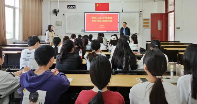 活动伊始,杨丽江讲解了征兵入伍优惠政策,号召同学们积极响应祖国号召,从戎报国,投身国防建设。