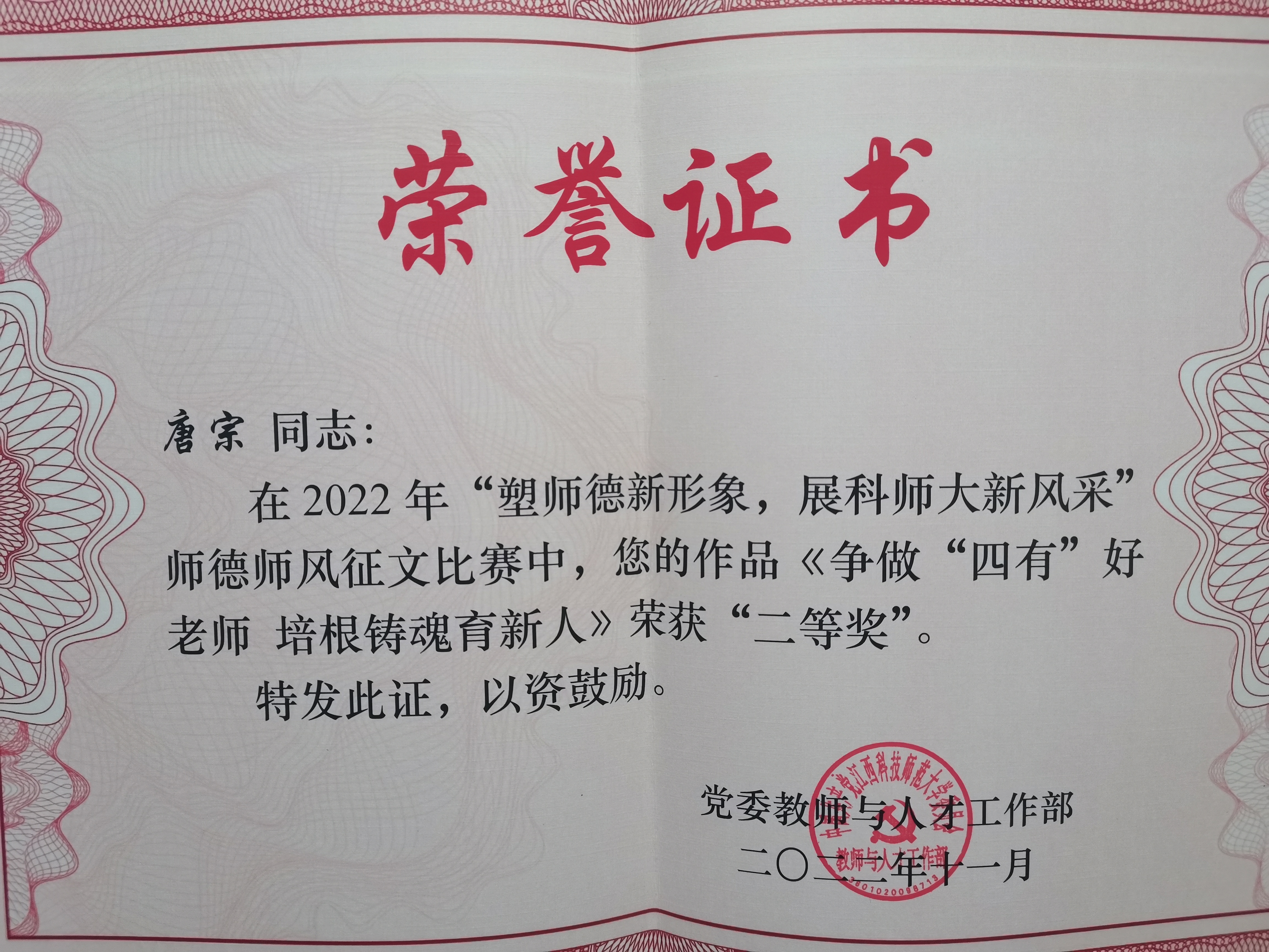 活动自实施以来,williamhill威廉希尔中国精心组织,广大教师积极参与,经过层层筛选,向学校推荐师德师风演讲比赛参赛选手2名,提交主题征文2篇、优秀工作案例2篇。其中,副院长张文星的《教研相长提质量,内联外接促发展》荣获优秀师德典型案例,辅导员唐宗的《争做“四有”好老师,培根铸魂育新人》在征文比赛中荣获二等奖,专任教师程婷立的《三尺讲台,不忘初心》、龚丽的《心跟随、爱相伴,喜迎二十大、永远跟党走》分别在演讲比赛中荣获三等奖和优秀奖。