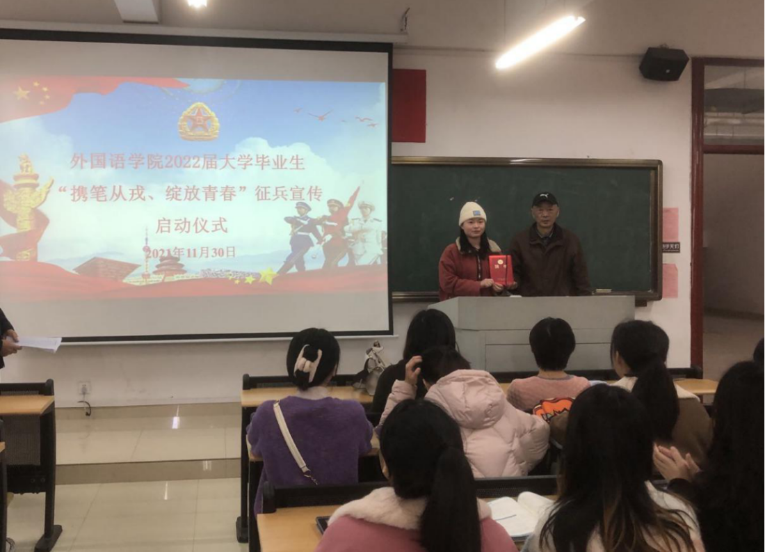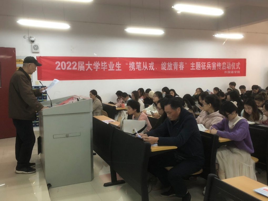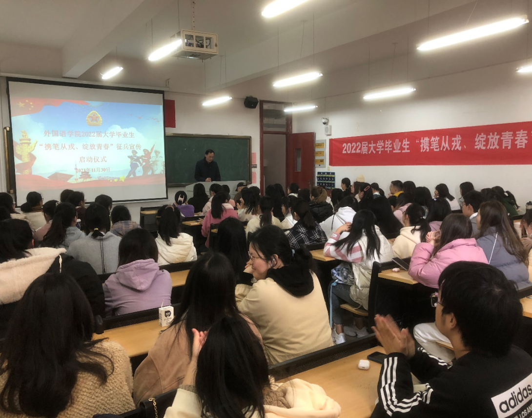 为激发大学毕业生参军报国热情,为部队征集更多高素质兵员,根据学校征兵工作领导小组通知要求,学院于11月30日在博学楼W3107举办征兵宣传启动仪式。仪式由学院党委副书记郑建峰主持,学院党委书记廖雄飞,学工办杨丽江、李利、秦文、皮卫阳等老师出席启动仪式,全院100多名在校大学毕业生参加。