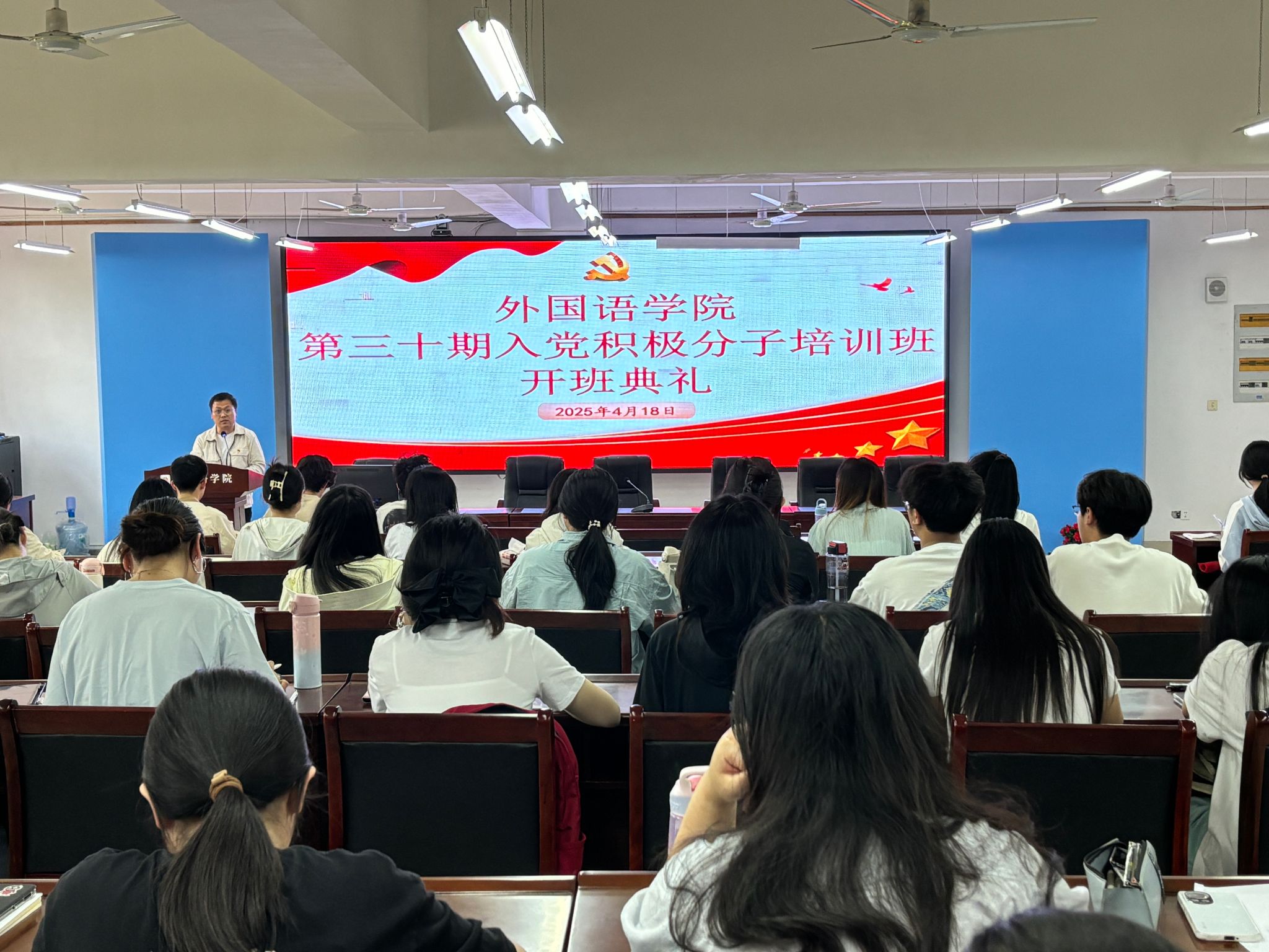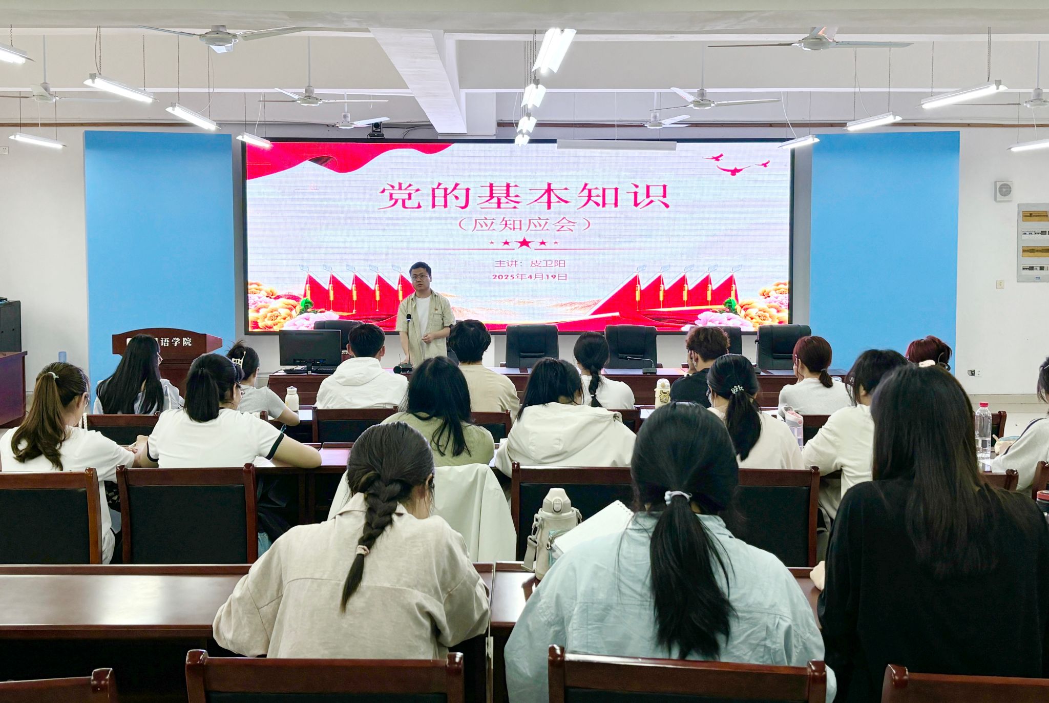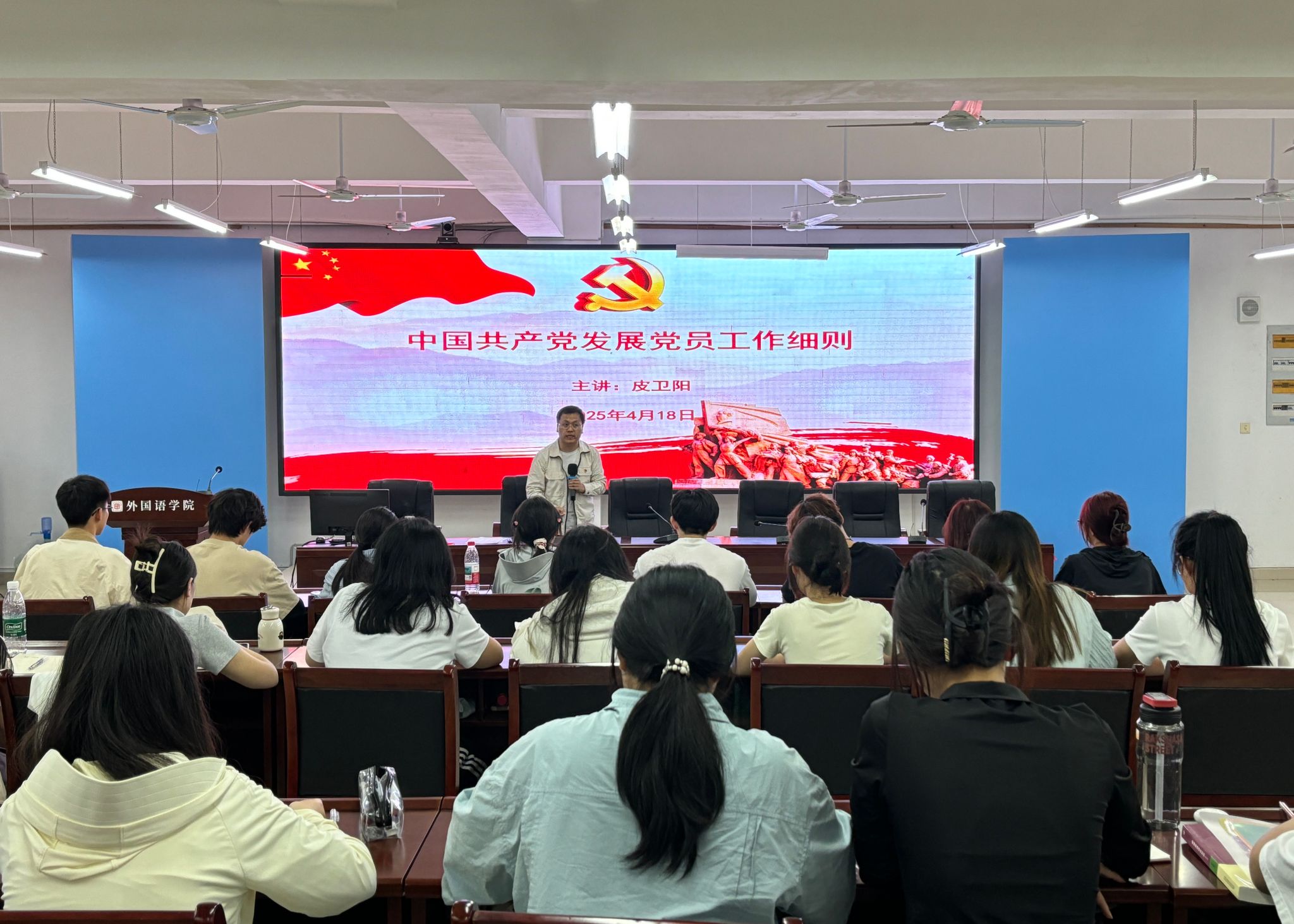 学生支部书记皮卫阳、苏昭、徐玉峰分别讲授了《中国共产党章程》《学习贯彻习近平新时代中国特色社会主义思想 发挥外语优势 讲好中国故事 传递中国声音》《中国共产党发展党员工作细则》《党的基本知识(应知应会)》等党课,青年博士教师李文围绕《中国共产党简史》,讲授了《伟大历史转折和中国特色社会主义的开创》党课。