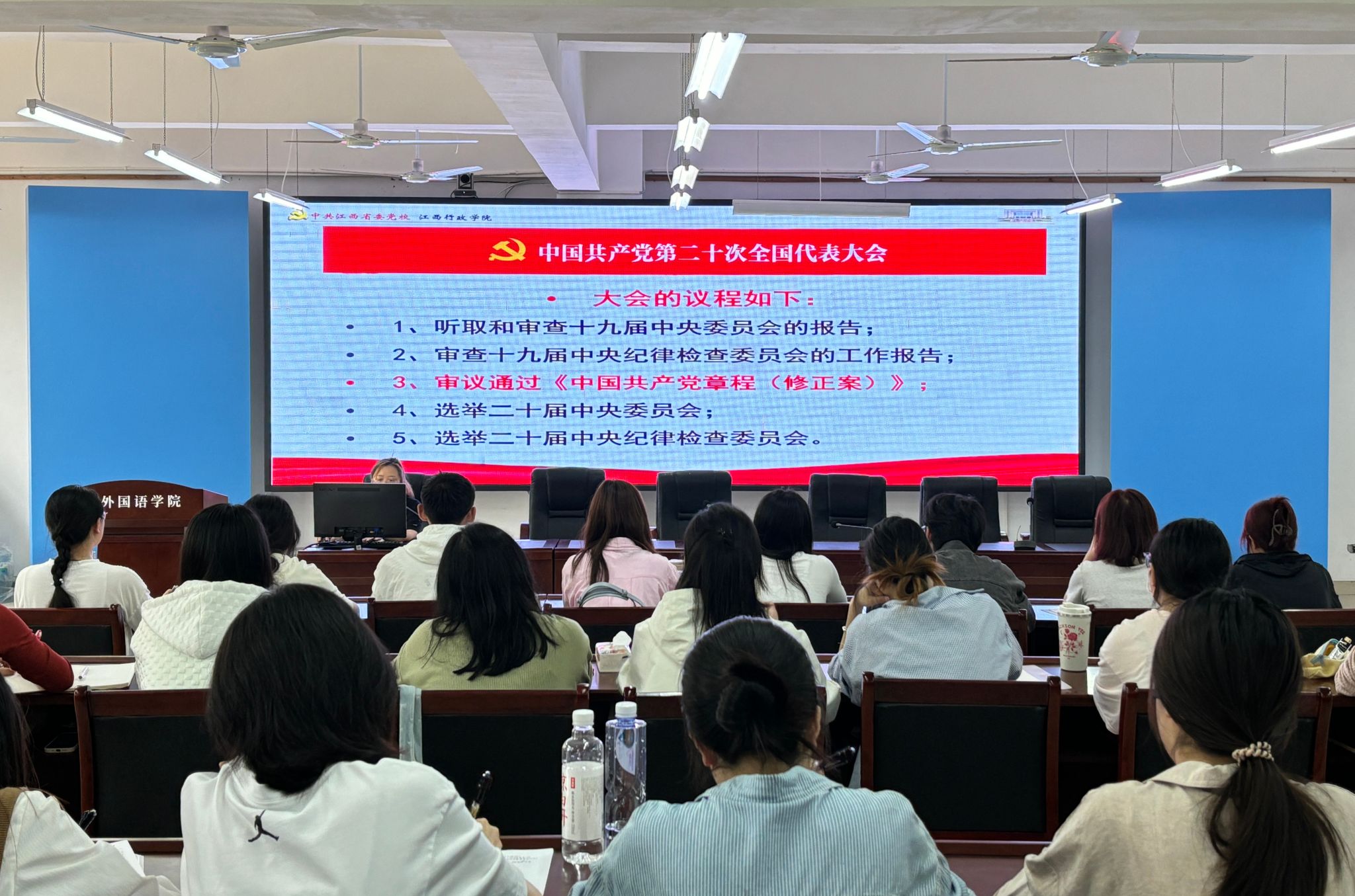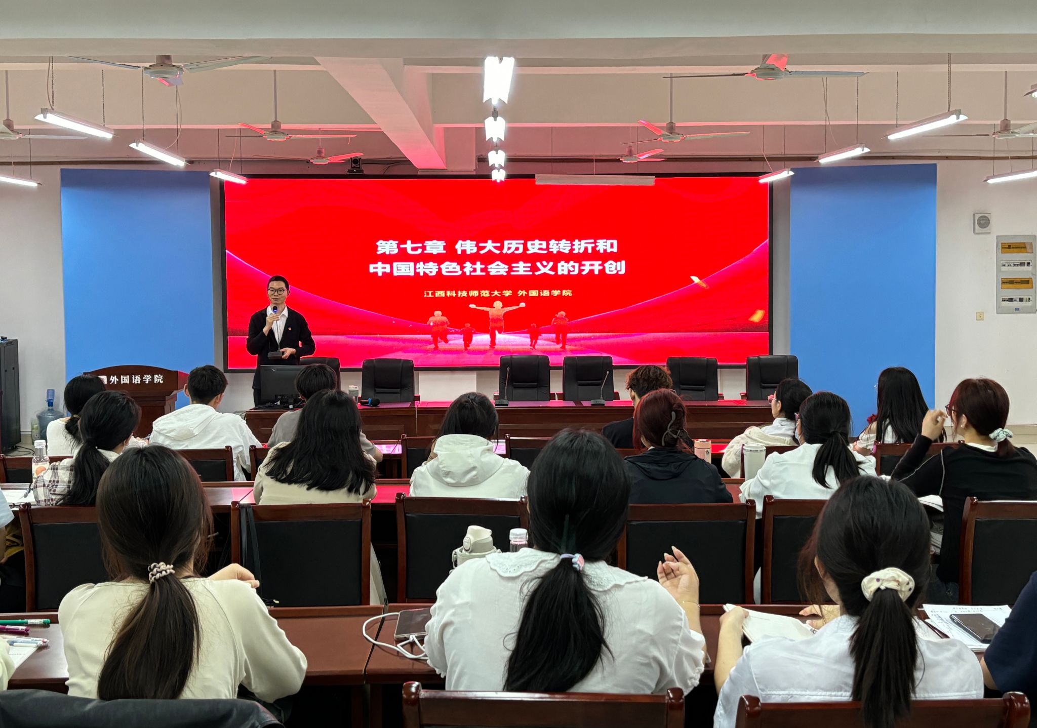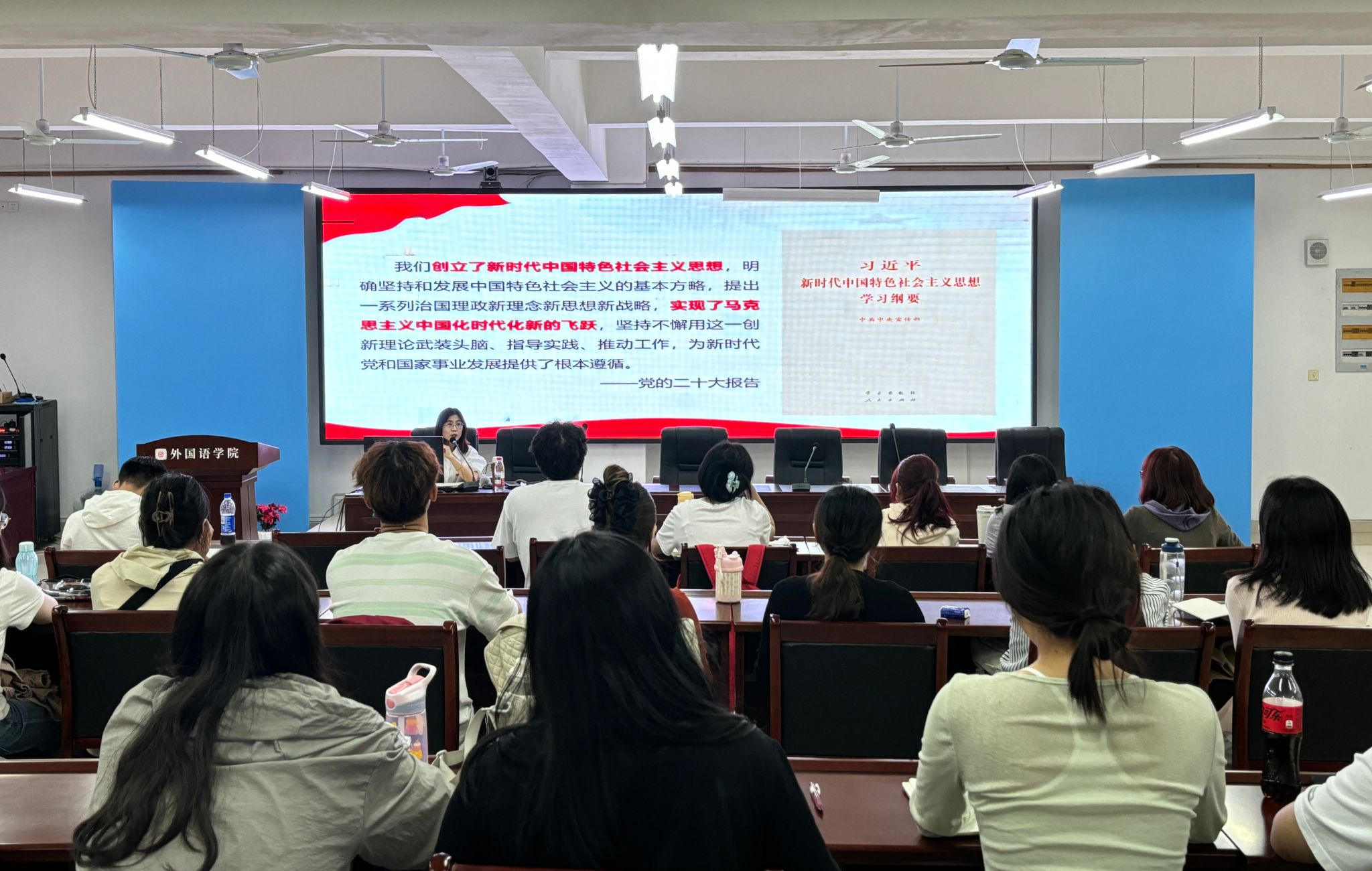 学生支部书记皮卫阳、苏昭、徐玉峰分别讲授了《中国共产党章程》《学习贯彻习近平新时代中国特色社会主义思想 发挥外语优势 讲好中国故事 传递中国声音》《中国共产党发展党员工作细则》《党的基本知识(应知应会)》等党课,青年博士教师李文围绕《中国共产党简史》,讲授了《伟大历史转折和中国特色社会主义的开创》党课。