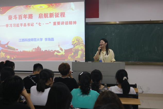 为深入贯彻习近平总书记“七一”重要讲话精神,教育引导学生学习党的光辉历史,感悟党的精神谱系,传承红色基因,厚植爱党、爱国情怀,以积极昂扬的状态奋进新征程。9月16日晚,校党史学习教育宣讲团成员、马克思主义学院李海晶博士深入学院,在博学楼W3107教室给新生宣讲习近平总书记“七一”重要讲话精神。学院新生100多人参加。