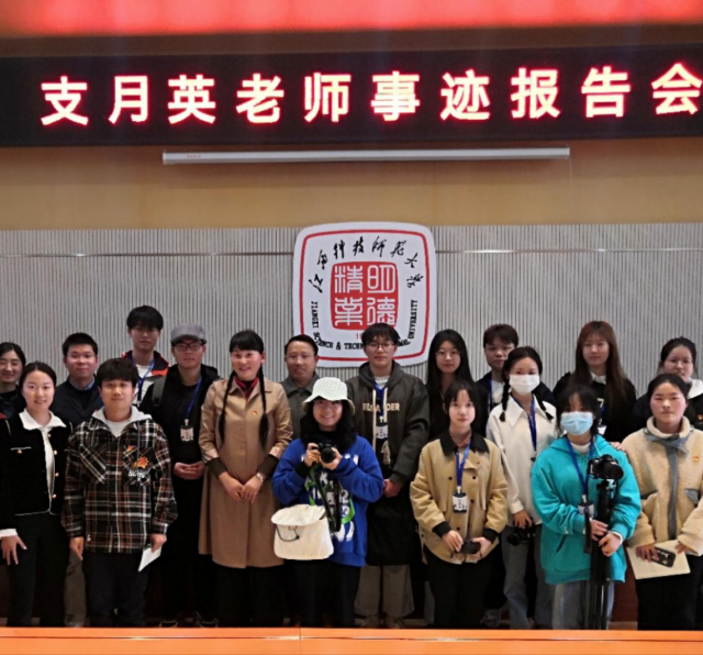 图为蔡华金参加支月英老师事迹报告会的新闻报道工作