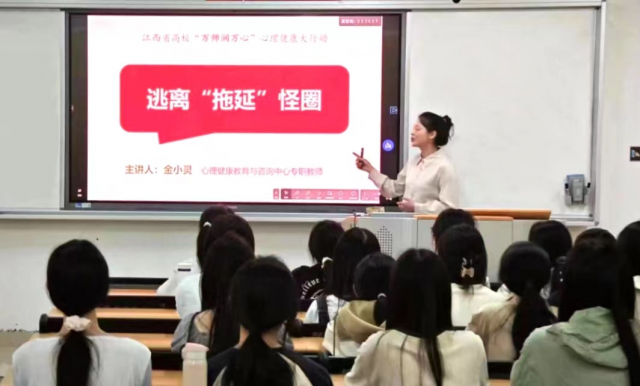 金小灵积极引导学生思考拖延给日常生活、学习带来诸多不便,结合生动的案例从不同角度讲述了拖延症预防与应对措施,倡导学生学会科学、合理地设定目标和规划时间。她还带领学生开展心理游戏,在活跃的气氛中让学生更好地掌握了“逃离拖延怪圈”的技巧。