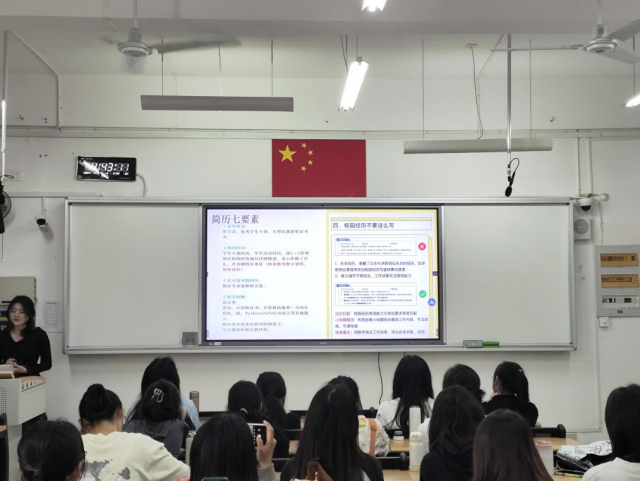 本次比赛分为简历设计学习、简历设计比拼、简历设计新的分享三个环节。主讲人首先通过一段简历设计的视频,向参赛者和观众展示了优秀简历模板的范例。随后详细介绍了简历的内容制作流程和七大要素等知识点,将简历的错误设计与正确范例进行对比并修改,从实践中开展简历设计知识教学。