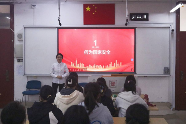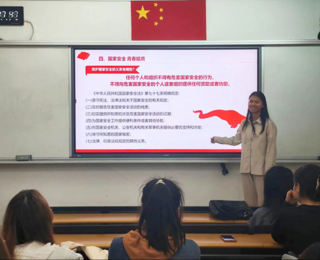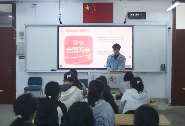 活动伊始,由各班团支部书记带领全体团员重温入团誓词,齐唱团歌。铿锵有力的誓言,雄壮激昂的歌声,传递着浓浓的爱国情,强化了团员的使命感。随后,各班团支部书记从不同角度分别讲述国家安全的内涵和意义,通过生动有趣的问答环节加深了广大团员青年对国家安全知识的理解。在团员分享环节,团员代表带领大家以全新的视角,进一步体会国家安全在现实生活中的意义,激励广大团员青年从自身出发,维护国家安全。