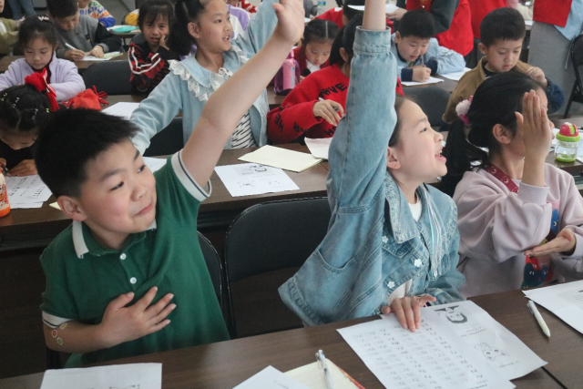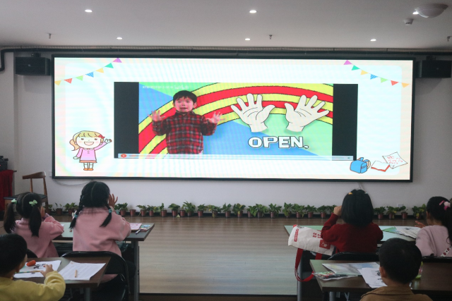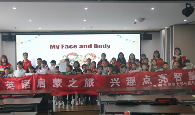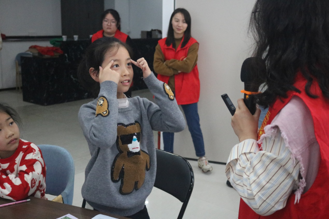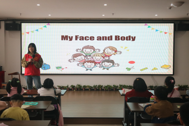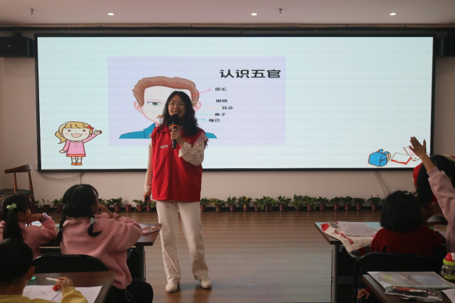 字母热身结束后,课程进入英语趣味课堂环节。志愿者通过“五官蹲、五官点点乐”的游戏激发孩子学习兴趣,教授五官和身体部位的英文单词。随后,通过“跟我读”“我说你指”“默契猜猜”“选词填空”“改错纠音”等环节,引导孩子们认真学习、积极思考、巩固读音、识记单词、完成练习。最后,孩子们跟随英文儿歌边唱边跳,本次志愿活动在轻松愉悦的氛围下落下帷幕。