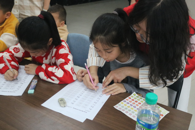 首先,志愿者们带领孩子们齐唱英文字母歌热身,复习26个英文字母的读音。随后,一对一指导孩子们在英语本上规范书写英文字母大小写,孩子们积极参与认真练习。完成后,志愿者给表现优秀的小朋友发放小红花以示鼓励。