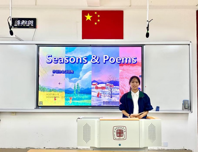 活动接近尾声,主持人总结道:“通过英文诗歌创作,我们再次感悟到四季之美。大自然是最美的诗,冬季将至,希望同学们能够告别冬季的疲懒,积极参加户外活动,走进大自然,发现美好。”最后,本次主题口语角活动在同学们的欢声笑语中圆满结束。