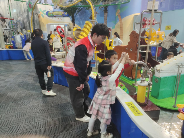 在科技馆儿童互动展区,志愿者们创新性地采用“体验式学习”模式,引导孩子们在沉浸式互动中感受科技魅力,并运用展馆内的声光电互动装置,向孩子们讲解基础科学原理,培养其创新思维和实践能力,实现“玩中学、学中悟”的教育效果。