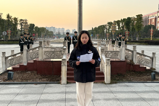 随后,学院学生会主席团成员张黄茜子在国旗下发言。她以“爱国主义教育”为主题,列举学院特色品牌活动,引导同学们在实际行动中体现爱国主义精神,强调新时代的大学生要树立以国家发展为己任的责任感,做到热爱祖国、服务人民;要传承和弘扬中华优秀传统文化,拥抱现代文明,做中西文化的桥梁;要具备社会责任感和担当意识,积极参与社会服务和志愿活动,用自身行动为社会带来正能量。