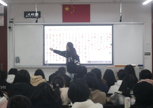 此次宣讲会邀请了两名在普通话水平测试中取得优异成绩的同学分享经验。2023英语(一本-师范)1班李展鹏详细介绍了普通话水平测试的主要环节,测试分为四个部分:单音节字词朗读、多音节词语朗读、短文朗读和命题说话。他指出,在考试过程中要注重字词的细节处理、保证声母准确及韵母饱满。与此同时,他还着重强调了规范普通话对于教师职业的重要性,鼓励同学们说好普通话,提高师范生的言语素质及表达能力。