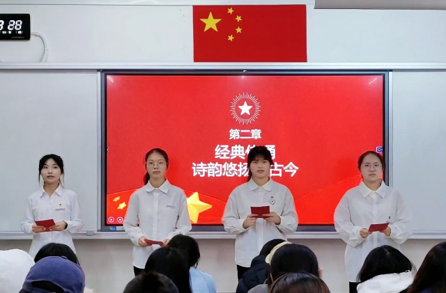 宣讲团成员付宝慧、徐雨晨、秦瑜鸿、叶建带来了朗诵《军旗飘扬,强军之路》,将先辈们英勇无畏、敢为人先的革命精神展现得淋漓尽致,让同学们更加真切地感受到革命先辈们的大无畏精神。