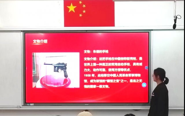 结合八一南昌起义的历史,本次宣讲还特别设置了“红韵瑰宝,烽火遗珍”文物介绍环节。宣讲团成员杨灵星向同学们介绍了八一馆中的文物,回顾历史,讲述文物背后的故事,使同学们深刻领悟到人民军队诞生的艰辛不易,认识到身为新时代青年肩负的责任与使命。