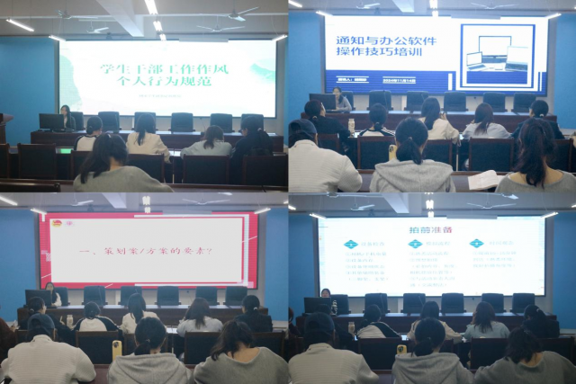 11月14日,院团委学生副书记陈秋岚、夏玲玲,院学生会主席团成员胡熙珍、张黄茜子分别就学生干部工作作风、个人行为规范、技能进行讲授。她们通过一问一答、列举案例、实际操作等方式,在互动中向学员们传授学生干部工作作风以及通知拟写、活动组织、材料汇编、稿件撰写、照片拍摄等工作技巧。