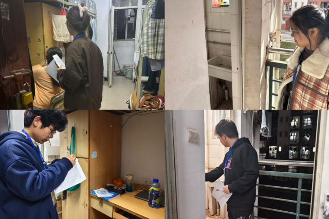 查寝工作同步开展。查寝小组前往学生宿舍,重点检查了宿舍阳台卫生状况、物品摆放整齐程度、乱接乱挂现象。多数宿舍环境整洁,物品摆放整齐,但部分宿舍仍存在洗漱间脏乱以及衣物随意堆放等现象。