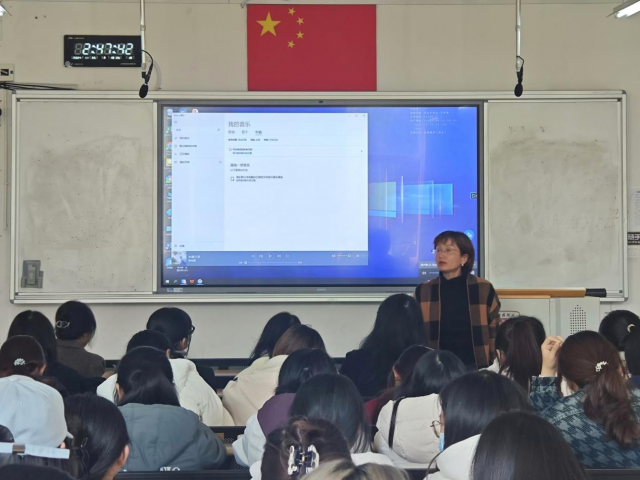 外国语学院心理专干李利首先强调,压力和情绪管理是个人成长的必修课,心理健康是当今社会关注的热点话题,更是个人健康的重要组成部分。她分享自己通过听音乐放松身心的经验,并现场播放《水墨兰亭》,悠扬的音乐让同学们心灵得到了沉静与放松。