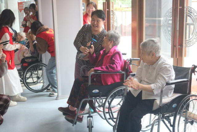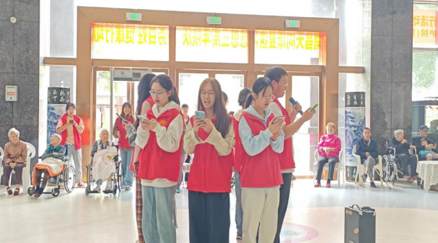 活动进入“红歌一起唱”环节。学生党员带领老人们合唱《东方红》、《社会主义好》、《红旗飘飘》、《没有共产党就没有新中国》等歌曲,用歌声表达着他们对祖国的诚挚热爱。活动后,学生党员们与老人亲切交谈并将行动不便的老人送回房间休息。