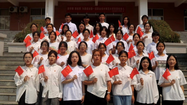 9月27日,williamhill威廉希尔中国拍摄国庆祝福视频。外院学子积极参与,手持五星红旗,佩戴团徽,面对镜头齐声颂扬祖国,共同表达对祖国母亲的诚挚祝福。