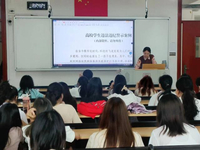 班会上,各辅导员班主任对高校学生违纪违法警示案例分类,并逐一分析以下案例类别,如:偷拍偷窥行为、违反网络安全行为、不当得利、非法访问境外网站、参与网络诈骗、违反考试纪律、违反学术道德、校园暴力、危害宿舍消防安全、盗窃违法行为、嫖娼、危险驾驶等等,告诫同学们不得触碰法律红线。此外,各辅导员班主任还为同学们介绍了民法典等相关法律知识:大学生是成年人,若有违法行为必定会受到法律惩罚,为避免卷入违法犯罪事件,同学们要知法守法、懂法用法。