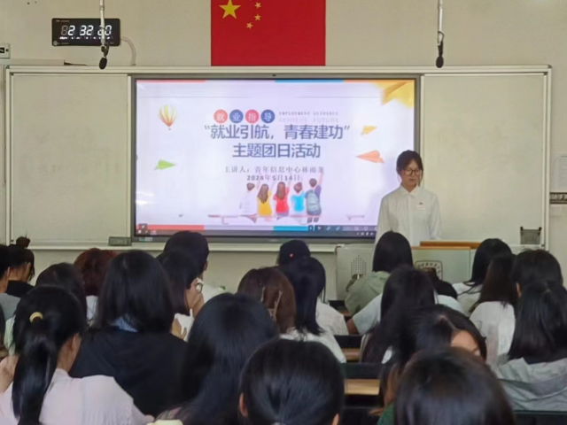青年信息中心工作人员林雨菲深入分析当前就业形势的总体情况,展示了我院毕业生的就业率和就业单位行业领域,明确指出了大学生就业的严峻现状,使同学们对当前就业形势有了更为清晰的认识。