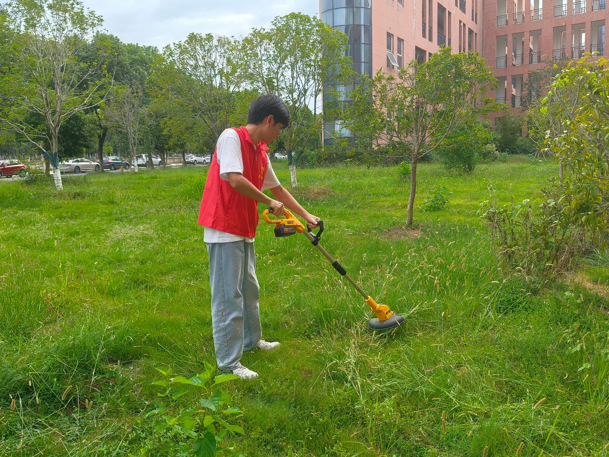志愿者们使用除草机、草耙、剪刀等专业工具,对学院门前草坪区域进行了全面清理,细致清除散落的垃圾杂物。重点清理了附着在学院空调外机上的杂草,有效保障了外机的正常散热,为师生创造了更加整洁、安全、舒适的学习与生活环境。