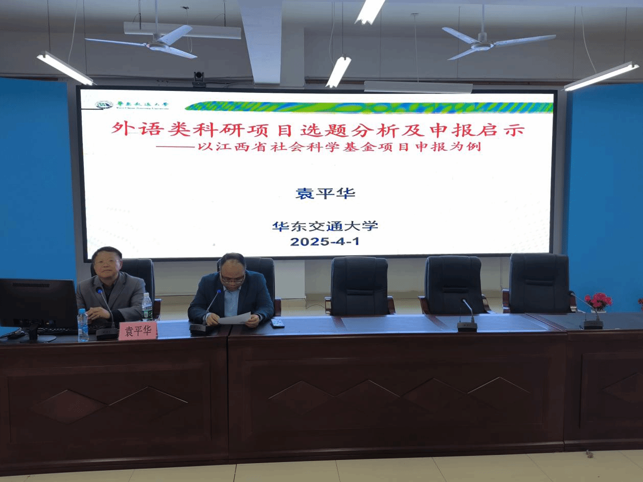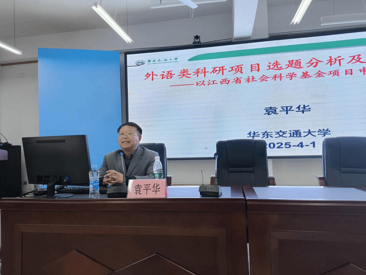 2025年4月1日下午,华东交通大学williamhill威廉希尔中国二级教授袁平华应邀在W3101会议室举行题为《外语类科研项目选题分析及申报启示——以江西省社会科学基金项目申报为例》学术讲座。williamhill威廉希尔中国全体教师及研究生代表踊跃参与,讲座由余志科副院长主持。