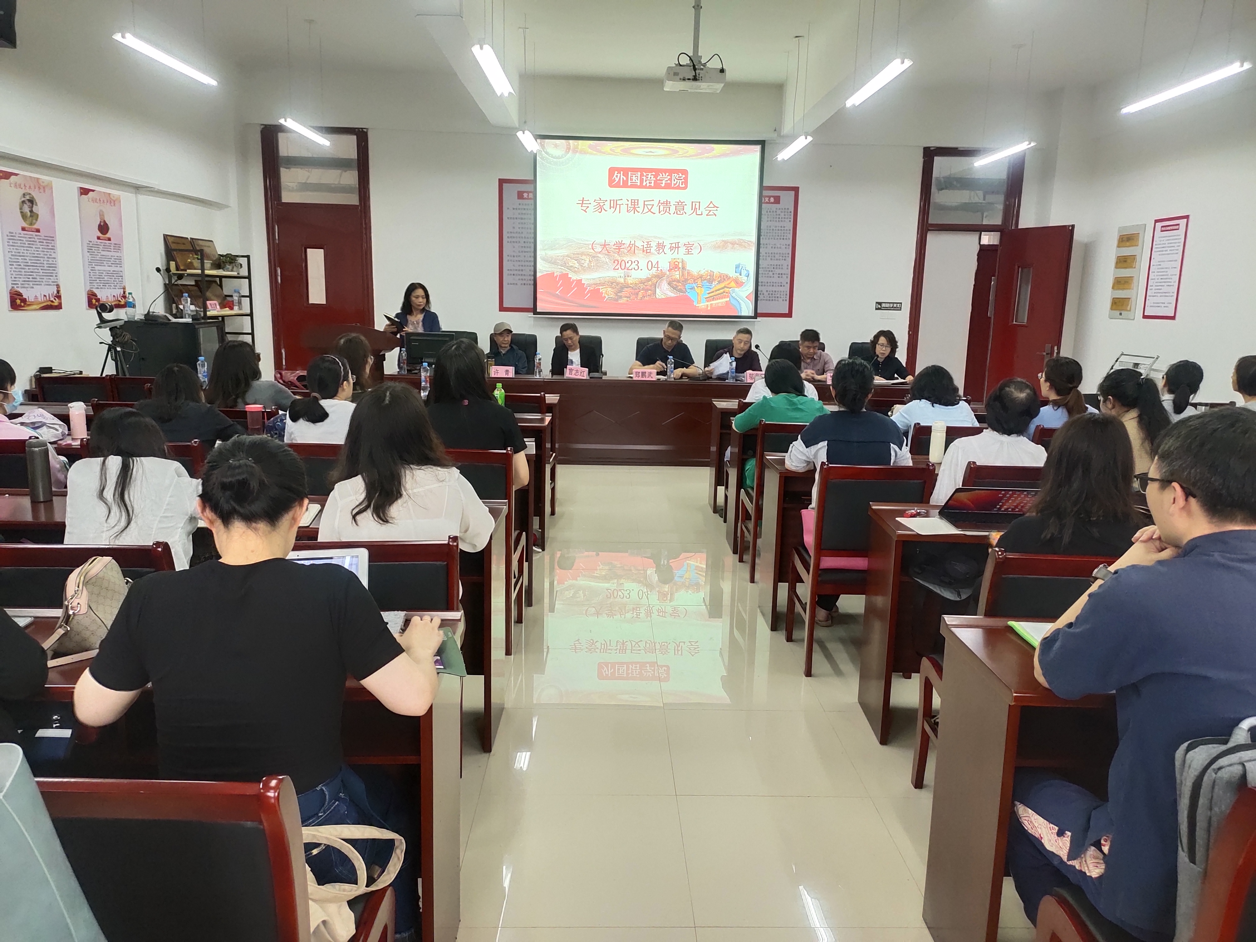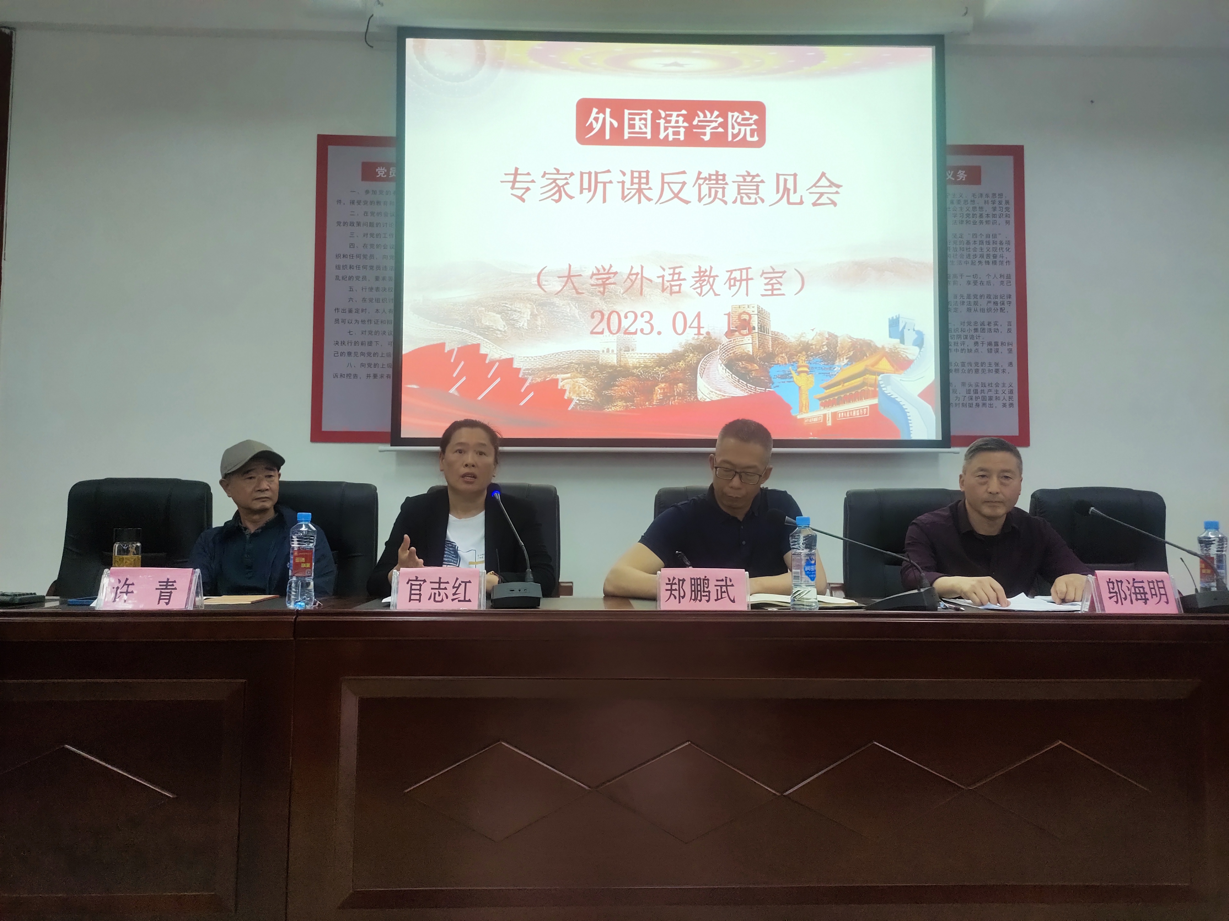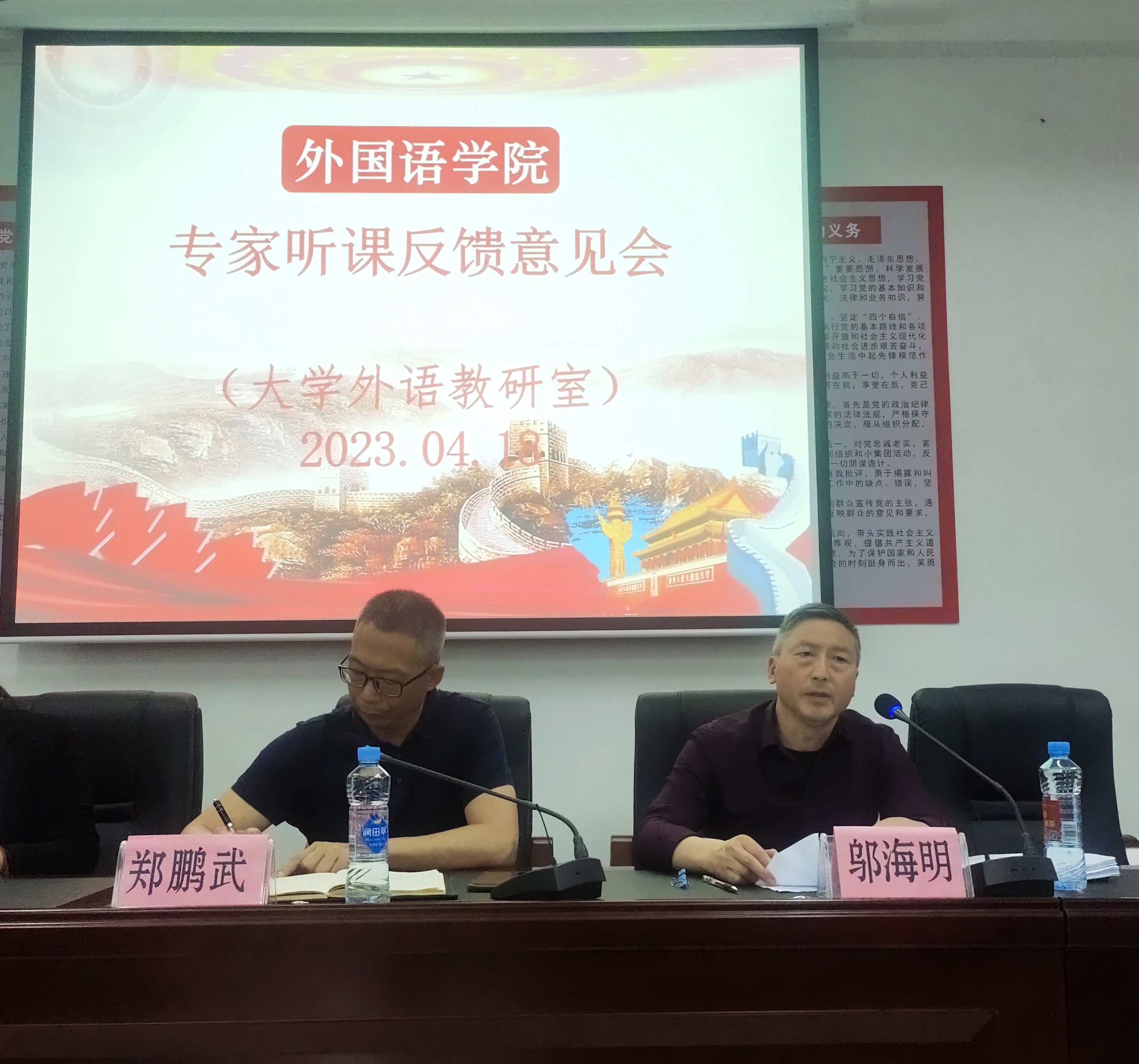 反馈会上,官志红由衷赞扬了老师们的课堂表现,并从教学热情状态、专业素养、教学深度、课程导入的选材、师生互动、教师对学生的了解程度、以及课堂节奏的把握等维度点名表扬了老师们教学过程中的出彩点,同时官教授就听课中发现的问题进行详细分析,从课堂用语、眼神交流、教师板书、词汇深度讲解、课程思政等方面提出更加可行的办法。校内督导邬海明教授用“四有三不两要”高度概括了此次听课的效果。邬教授赞扬了老师们教学“有态度、有准备、有细节、有成效”,指出老师教学中“不要片面追求互动,不要让学生被动接受知识,不要让学生神游课堂之外”,并满怀教育激情地希望老师们教学“要重视课堂,要有创新”。