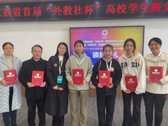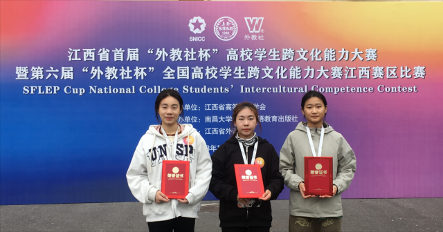 江西省首届“外教社杯”高校学生跨文化能力大赛暨第六届“外教社杯”全国高校学生跨文化能力大赛(江西赛区)于2023年11月25日至26日在南昌大学(前湖校区)举行。经过精心准备和精彩呈现,我院学子徐静怡, 王羽菲、唐梦舒团队荣获一等奖。