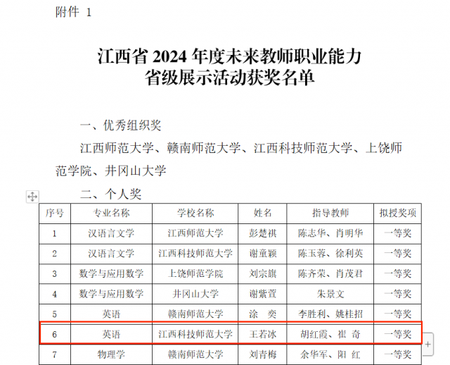 近日,江西省2024年度未来教师职业能力省级展示活动结果公示,我院2021级英语(一本-师范)3班的王若冰同学荣获英语学科组一等奖,指导老师为胡红霞、崔奇。