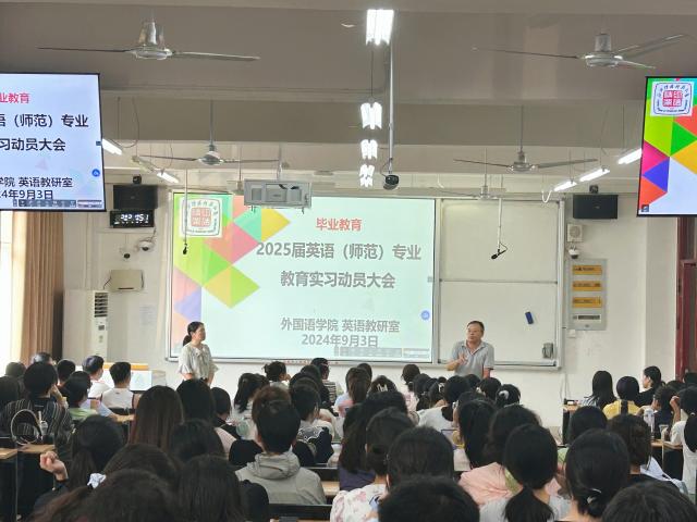 为了增强2025届英语(师范)专业毕业生的教育实践能力,为学生提供全面的指导和鼓励,williamhill威廉希尔中国于9月3日下午15:30在文科楼W1102教室召开2025届英语(师范)专业教育实习动员大会。williamhill威廉希尔中国教学副院长张文星出席会议,会议由英语系主任胡红霞主持。2025届英语(师范)专业全体学生参加会议。