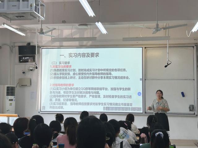 随后,胡红霞老师对2025届英语(师范)专业的教育实习计划进行了全面而细致的解读。她围绕实习时间、实习内容及要求、实习过程管理以及实习考核标准等多个方面进行了详细说明,帮助学生对即将来临的实习工作建立清晰的认识、做好充分的准备。胡老师强调,此次实习工作不仅是对师范生专业技能的一次全面检验,更是对其综合素质、职业素养及团队协作能力的一次重要锻炼。她勉励学生们要珍惜此次难得的实习机会,积极向一线中学教师学习,勇于接受挑战,不断提升个人教育教学能力。