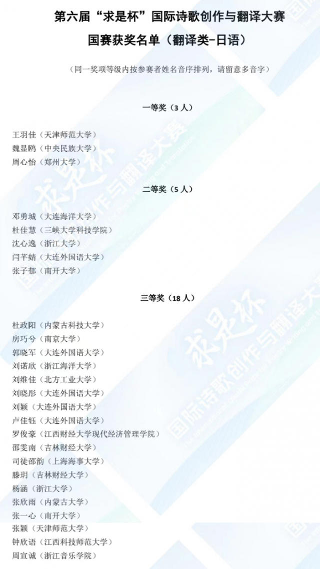 在近日落幕的“第六届‘求是杯’国际诗歌创作与翻译大赛”(日语赛道)中,经省赛、决赛两个环节的激烈角逐,最终我院学子发挥出色,21级日语班钟欣语同学荣获本次大赛翻译类国赛三等奖。