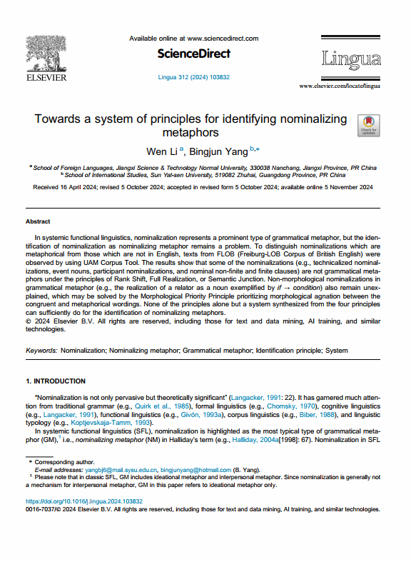近日,我院李文博士在语言学知名SSCI(二区)和A&HCI期刊Lingua发表了题为“Towards a system of principles for identifying nominalizing metaphors”的学术论文。