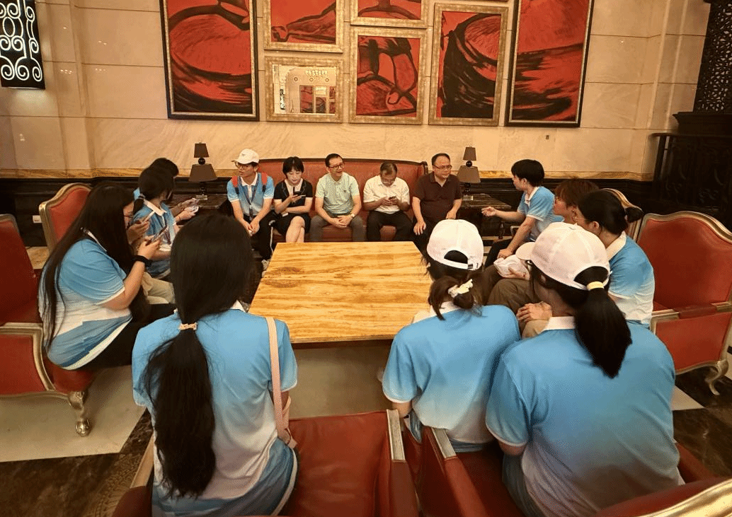之后,赖以柱一行与学生志愿者进行了座谈。学生们畅谈了自7月14日论坛主题采风活动正式启动以来,三天的翻译经历和感受。赖以柱代表学院对志愿者的辛苦付出表示感谢,同时要求志愿者们与外宾交流过程中的言行举止要注意保持国际礼仪和注重维护国家安全与荣誉。张文星从江西文化国际传播角度讲述了如何“讲好江西故事”,并表示希望同学们能在实践中不断强化和优化专业所学,培养国际视野和家国情怀。余志科从国家战略、地方经济和学校专业建设和发展三个角度,讲述了如何用好国际化平台,培养跨文化交流能力,促进文明互鉴。付悠悠从听力理解、语言转换等专业角度对实践中如何做好口译志愿者提出了具体建议和要求。