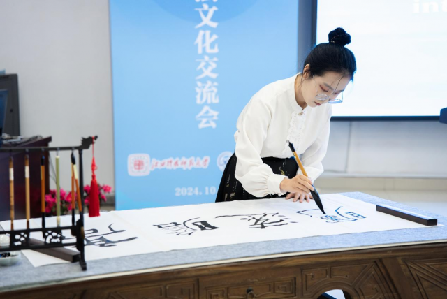 交流会中间举行了文化艺术活动。身着传统服饰的中方学生竹笛独奏《扬鞭催马运粮忙》,古筝演奏《渔舟唱晚》,一首首悠扬喜庆、轻松愉悦、富含东方文化气息的曲子和现场书法展示、书法作品赠送将文化交流会推向高潮,现场气氛热烈,掌声阵阵。在合奏《茉莉花》的曲调中,交流会进入尾声。