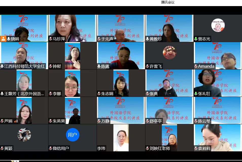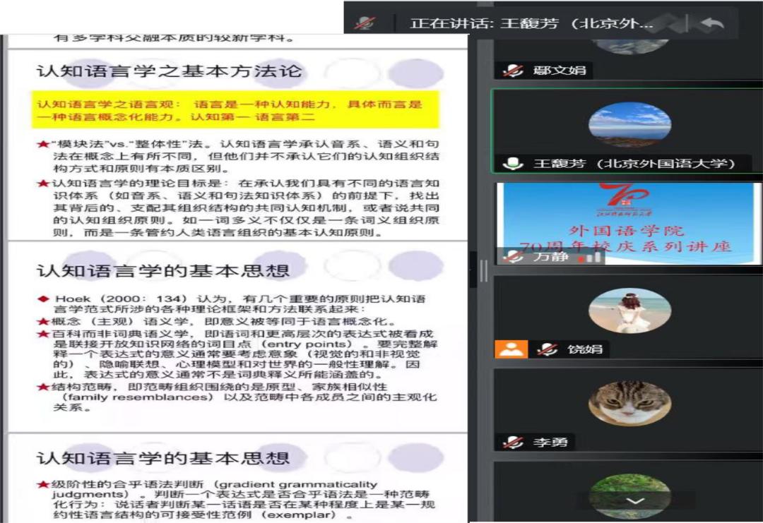 为庆祝我校70周年校庆活动,williamhill威廉希尔中国于11月18日18:30邀请北京外国语大学外国语言研究所教授、博士生导师王馥芳做讲座(线上),讲座由williamhill威廉希尔中国院长黄教珍主持,全体教师和部分研究生参加。王教授结合自己的教学和科研从认知语言学概念、核心议题、基本方法论和基本思想给大家详细讲解认知语言学知识。同时从基本、中级、中高级和高级等角度分析认知视角下的科研能力指向目标,从问题意识,研究视角、方法论等视角分析科研创新理论向度;从外部和内部两方面阐述提升科研能力的关键要数。